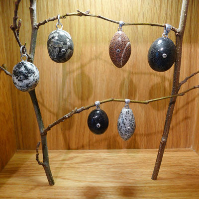 Halskjeder og anheng laget av reinsdyrgevir, never og bergarter som feks larvikitt og rombeporfyr, og sølv. Råmaterialene bearbeides fra start til ferdig produkt i verkstedet utenfor Stavern.