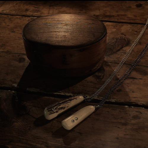 I disse smykkene bruker jeg naturmaterialer som reinsdyrgevir, horn, fiskeskinn og never kombinert med edelt metall. Materialene er fra våre kalde, hvite områder, fra vidder og hav. Snøen og det hvite symboliserer det rene, hvite, kalde, det uforstyrrede og mektige. Derav navnet på kolleksjonen, SNJOR (norrønt ). Samtidig indikerer det klodens helsetilstand. Materialene jeg bruker er fra naturen og kan nedbrytes til den igjen.