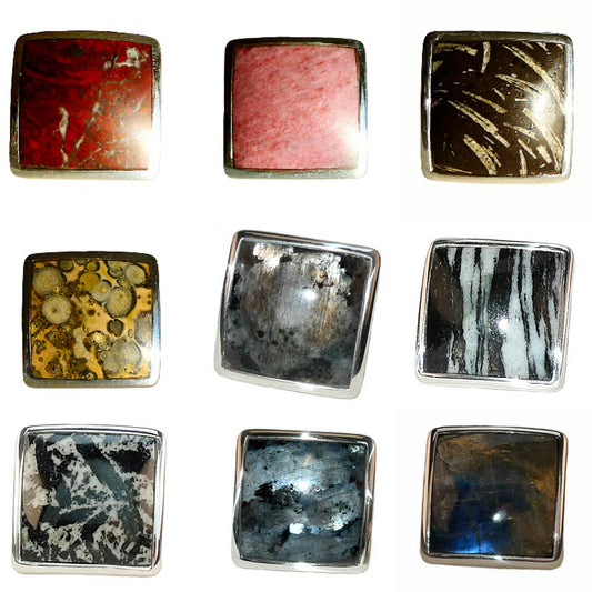 Jeg bruker norske og nordiske bergarter som råmaterialer. Dette er smykkestener av det vakreste slag som feks larvikitt, thulitt, amasonitt, rombeporfyr, gneis, jaspisbreksje etc. Hver stein kuttes, slipes og poleres på verkstedet.
